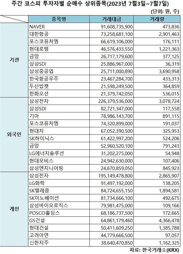 [표] 주간 코스피 기관·외인·개인 순매수 상위종목(7월3일~7월7일)