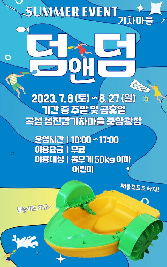 곡성군(군수 이상철)이 섬진강기차마을에서 오는 8일부터 8월 27일까지 주말·공휴일 17일간 에어풀장 패들보트 놀이존을 운영한다고 밝혔다.