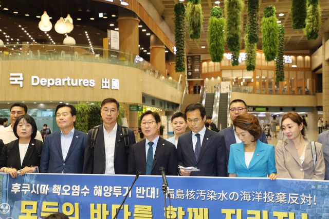 민주당과 무소속 의원 11명으로 구성된 ‘후쿠시마 핵 오염수 해양투기 저지 국회의원단’은 이날 오전 김포공항에서 기자회견을 열고 “일본 정부의 후쿠시마 핵 오염수 해양 투기는 다시 돌이킬 수 없는 행위이고, 해양 오염은 전 인류에게 영향을 미치는 재난”이라며 이같이 강조했다.