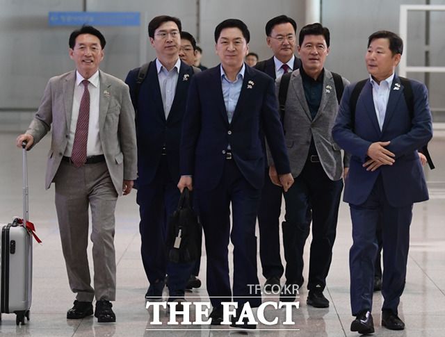김기현 국민의힘 대표와 주요 당직자들이 10일 오전 인천국제공항 제2터미널 출국장에서 미국으로 출국하고 있다. /이새롬 기자