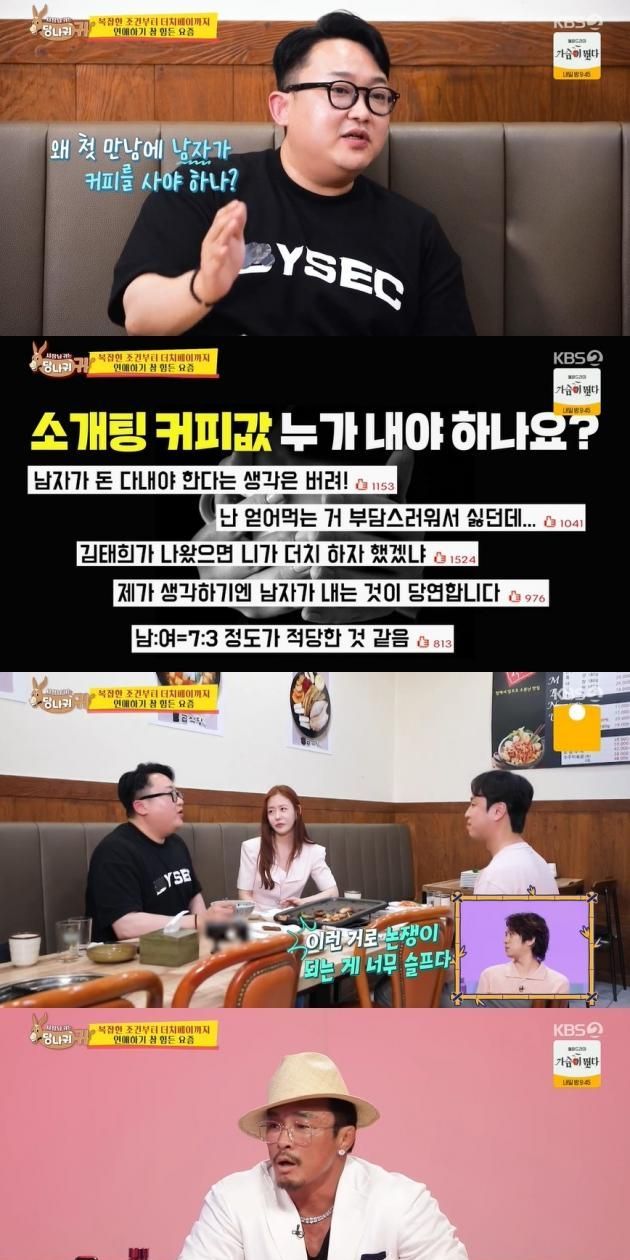 이어 직원은 소개팅에서의 커피값 논쟁도 있었다고 말해 눈길을 끌었다. 그는 "회원 중에 한 남성분과 일주일 동안 논쟁한 적이 있다"며 "커피값을 누가 내야 하냐, 왜 첫 만남에 남자가 커피를 사야 하냐고 하더라"고 털어놨다. 이어 다른 직원은 "저는 아내한테 그 얘길 들었다"며 "친구가 소개팅을 했는데 여자가 커피값을 더치페이하자니까 남자가 좋아했는데 그 이유가 '더이상 금전적으로 엮이기 싫어서'라고 하더라, 더치페이하고 끝이라는 의미"라고 말해 놀라움을 자아냈다.