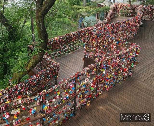 하지만 커플들이 걸어 놓은 자물쇠가 남산을 꽉 채우면서 환경을 오염시킨다는 지적이 나온다. 오랜 시간 비·바람을 맞아 녹슬어 버린 자물쇠가 식물과 야생동물에 영향을 줄 수 있다는 우려 때문이다. 머니S가 사랑의 자물쇠가 채워진 남산공원을 찾았다.