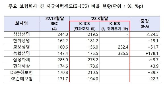 주요 보험회사 신 지급여력제도(K-ICS) 비율 현황 [사진=금융감독원]