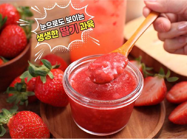 딸기 과육 함량이 무려 80%로 과육이 눈으로 생생하게 보이며 달콤하게 씹히는 식감이 매력적이다. 제철 딸기의 상큼하고 달콤한 맛과 향을 그대로 보존하기 위해 급속냉동하여 일반 딸기청이랑은 차원이 다르다.