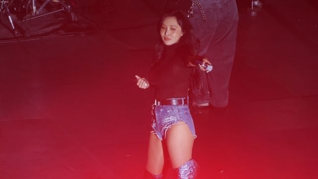 몸에 밀착한 검은색 티셔츠와 짧은 청 반바지 차림을 하고 무대에 선 화사는 이날 자신의 노래인 '주지마'를 선곡했는데, 무대 도중 깜짝 퍼포먼스로 사람들 시선을 빼앗았다.