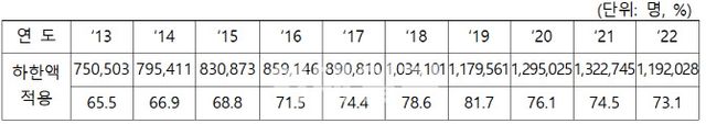 실업급여 하한액 적용자는 해마다 70% 이상을 차지한다. 지난해 실업급여 수급자 163만1000명 중 하한액을 적용받은 사람은 119만2000명(73.1%)이다. 하한액 적용자는 청년 세대의 비율이 85%로 압도적으로 높다. 다음으로 △60세 이상(72%) △30~39세(71.2%) △50~59세(70.2%) △40~49세(68.5%) 등의 순이다.
