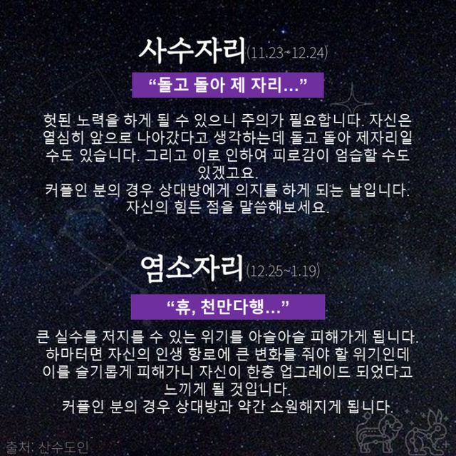 커플인 분이라면 후회가 없도록 사랑을 하는 것이 좋겠습니다. 이것저것 재어가며 사랑을 한다면 나중에 후회를 하게 됩니다. 싱글인 분에게는 좋은 애정운이 들어와 있으니 미팅이나 소개팅에 적극적으로 참여해 보세요. 물론 말은 가급적 적게 하는 것이 좋겠네요.