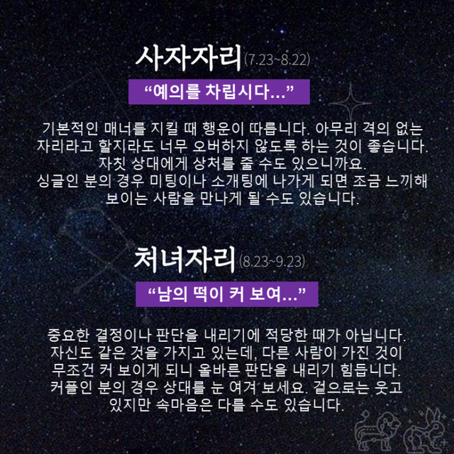 싱글인 분이라면 궁색하게 굴지 않도록 하세요. 이성과의 만남에서 궁색한 모습을 보이면 제대로 성사가 되지 않습니다. 커플인 분의 경우에는 상대방과의 약속을 어기지 않도록 주의해야 합니다.