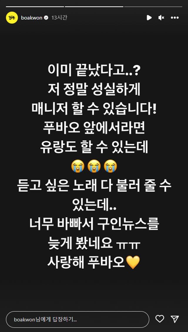 다만 해당 구인은 이미 기간이 지난 상황. 보아는 이러한 소식을 접한 뒤 "이미 끝났다고? 저 정말 성실하게 매니저 할 수 있습니다!"라며 "푸바오 앞에서라면 유랑도 할 수 있는데, 듣고 싶은 노래 다 불러 줄 수 있는데, 너무 바빠서 구인 뉴스를 늦게 봤네요"라고 눈물 이모티콘을 남겼다. 그러면서도 "사랑해 푸바오"라며 애정을 과시해 눈길을 끌었다.