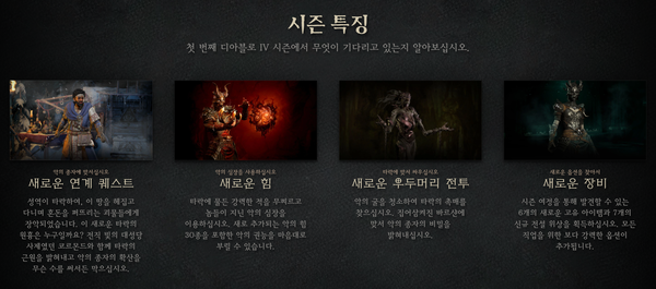 ‘디아블로4’새 시즌이 오는 7월 21일 새벽 2시부터 시작 된다. 이번 시즌에서는 새로운 유물 6종과 함께 악마의 씨앗이라는 개념인 신규 강화체(일종의 보석)등이 포함된 업데이트로 유저들을 맞이하게 된다. 이를 통해 좀 더 강화된 캐릭터로 게임을 즐길 수 있게 될 것으로 보인다. 시즌을 향한 기대치도 높다. 현재 보유 캐릭터외에 타 직업을 즐겨보고 싶지만 다시 키우기에는 부담되는 유저들이 새로운 도전에 나설 수 있게 될 것이며, 새로운 밸런스안에서 핵앤 슬래시 쾌감을 느끼고자 하는 유저들이 자유롭게 게임을 즐길 수 있게 된다.