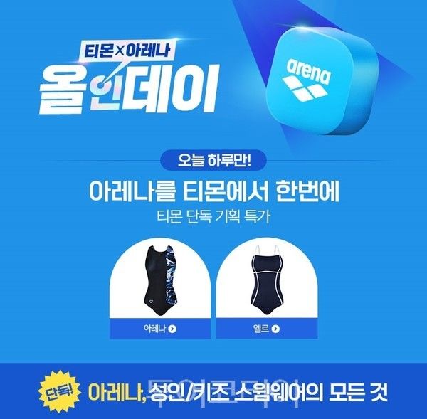 [투어코리아] 티몬이 여름휴가철을 맞아 오늘(11일) 단 하루, ‘아레나 올인데이’를 열고 아레나, 엘르 등 인기 워터스포츠 브랜드를 단독 특가로 선보인다.