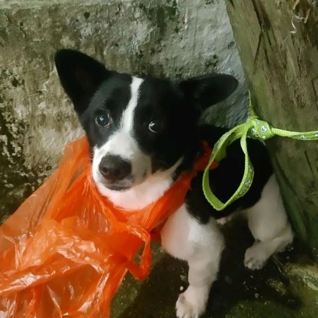 머리에 주황색 비닐봉지가 씌워진 채 버려진 강아지는 부산 부산진구 가야동 한 골목에서 발견됐다. 발견 당시 강아지가 차고 있던 연두색 목줄은 골목 가에 심긴 나무에 묶인 상태였다.