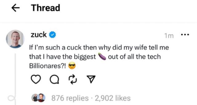 이를 알게 된 저커버그는 스레드에 "내가 정말 약골이라면 왜 내 아내는 나에게 억만장자들 중 가장 크다고 말했겠어?!"라고 응수하며 가지 이모티콘을 덧붙였다.