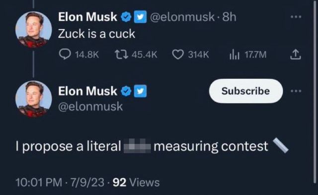 머스크는 지난 10일 트위터에서 한 사용자의 게시물에 "저커버그는 약골(cuck)"이라는 멘션을 달았다. 또한 저커버그에게 직접 "말 그대로 성기 크기 대결을 제안한다"라며 자 모양의 이모티콘까지 남겼다.