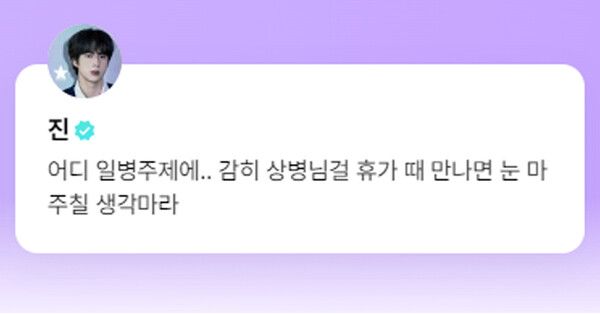 지난 9일 진은 팬 커뮤니티 플랫폼 위버스를 통해 상병이 된 근황을 전했다. 그는 멤버 제이홉이 팬들에게 보낸 편지를 보고 "너 뭐냐 홉이의편지. 이거 내 콘텐츠 왜 따라 하냐. 입금해라"라고 댓글을 달았다.