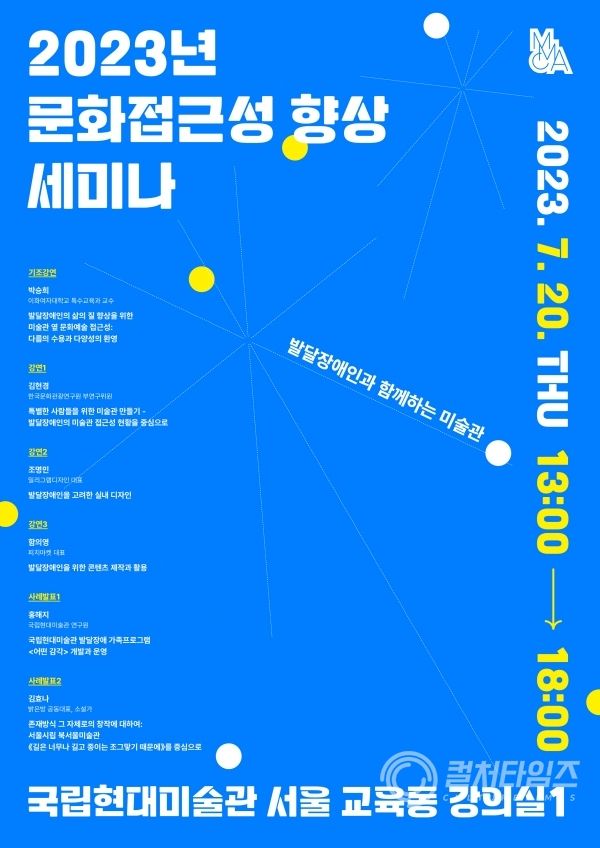 국립현대미술관(MMCA)은 7월 20일(목) 2023 문화접근성 향상 세미나 <발달장애인과 함께하는 미술관>을 서울관 교육동에서 개최한다고 밝혔다.