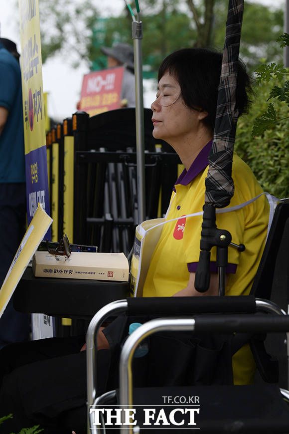 [더팩트ㅣ서예원 인턴기자] 일본 후쿠시마 오염수 해양 투기에 반대하며 단식 중인 이정미 정의당 대표가 12일 오전 서울 종로구 주한일본대사관 앞 단식 농성장에서 농성을 17일째 이어가고 있다.