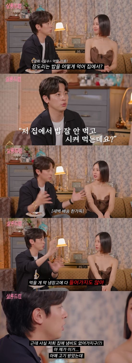 박정민은 "(김)혜수 선배님이 제게 '밥은 어떻게 먹냐'고 물어보시더라. 그래서 '집에서 밥 잘 안 먹고 시켜 먹는다'고 했더니 새벽 배송으로 고기랑 이것저것 엄청 챙겨주셨다"며 "다음 날 '고기 잘 받았냐'고 여쭤보셔서 '사실 저희 집에 냄비가 없다'고 했더니 다음 날 불판이 오더라"라고 했다.