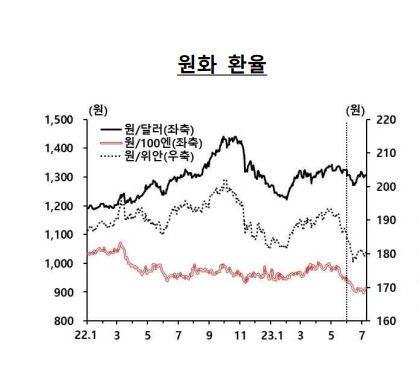 원/엔 환율도 5월 951.1원에서 6월 911.1원으로 내려왔다. 이달 들어 소폭 상승하며 지난 10일 916.7원으로 올랐으나 5월 대비해선 3.8% 낮다.