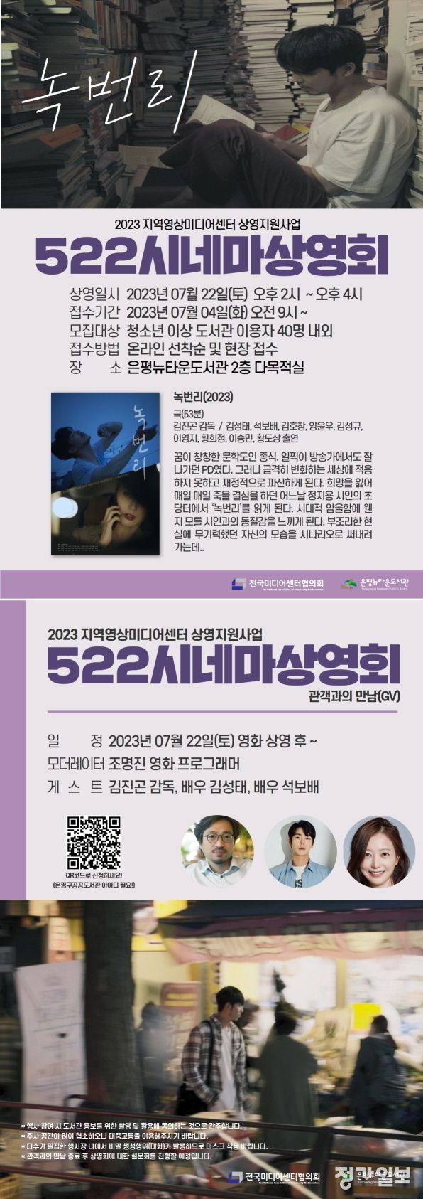 구립은평뉴타운도서관(관장 박종범)은 전국미디어센터협의회에서 주관하는 ‘2023년 지역영상미디어센터 활성화지원-상영지원 사업’의 참여 기관으로 선정돼 7월 22일(토) ‘522시네마상영회’를 운영한다고 밝혔다.