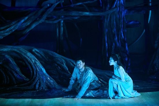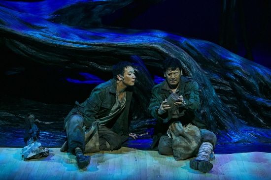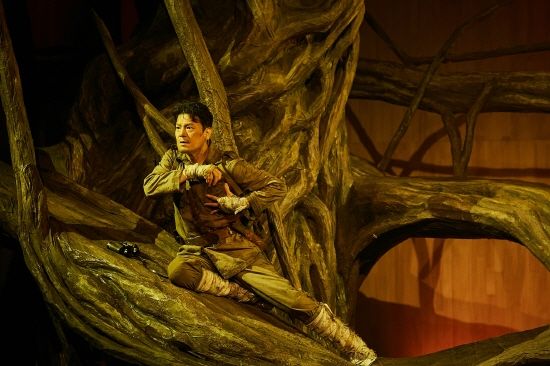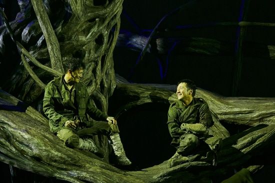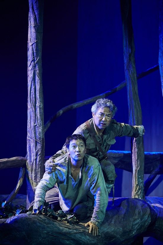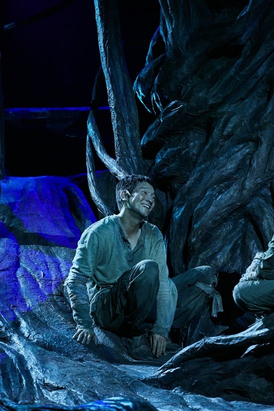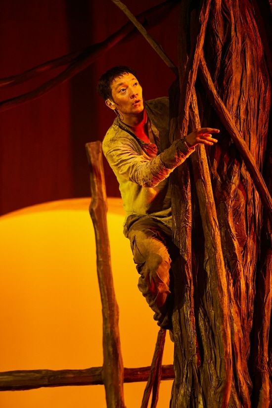무대에는 ‘몸통을 덮은 줄기가 사람 키의 5배가 넘는다’라는 묘사처럼 거대한 나무가 자리했다. 을씨년스러운 분위기를 풍기며 전쟁 중의 긴장감을 느끼게 한다. 배우들은 마치 높은 나무 위에 올라와 있는 것처럼 좌우, 상하로 이동하며 대사를 주고받는다.