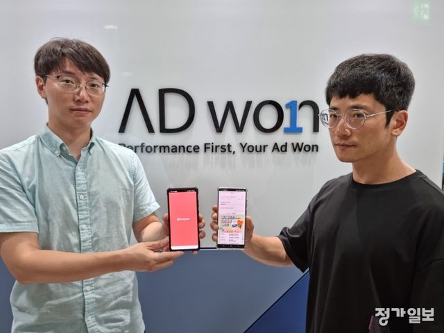 ▲ 왼쪽부터 애드원 유수준 팀장, 조우상 팀장이 ‘런투게더’ 앱을 이용해 챌린지 참여를 시연하고 있다