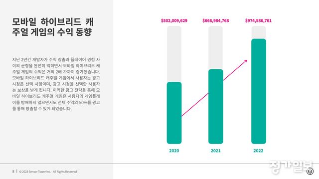 지난 2년간 모바일 하이브리드 캐주얼 게임의 수익은 거의 2배 가까이 증가했다. 모바일 하이브리드 캐주얼 게임에서 광고 시청은 선택 사항이며, 광고 신청을 선택한 사용자는 보상을 받게 된다. 이러한 광고 전략을 통해 모바일 하이브리드 캐주얼 게임은 사용자의 게임 플레이를 방해하지 않으면서도 전체 수익의 50%를 광고를 통해 창출할 수 있게 됐다.