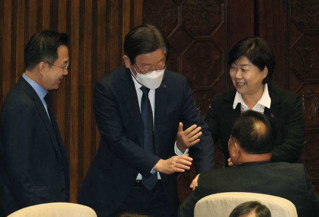 더불어민주당 이재명 대표가 지난 3월 30일 오후 열린 국회 본회의에서 이상민 의원(뒷모습)과 인사를 나누고 있다. (사진= 연합뉴스)