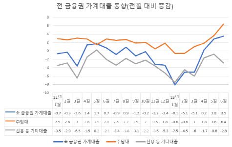금융당국은 6월중 은행과 2금융권을 모두 합친 전 금융권 가계대출이 3조5000억원 증가해 3개월 연속 늘었다고 12일 밝혔다. 주담대가 6조4000억원 증가했다. 4개월째 증가세이자 증가폭은 전달보다 2조8000억원 커졌다. 신용대출 등 기타대출이 2조9000억원 감소했지만, 주담대가 급증하면서 전체 가계대출은 한달 새 3조5000억원 증가했다.