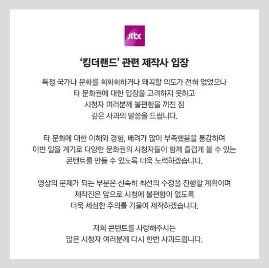'킹더랜드' 측은 "특정 국가나 문화를 희화화하거나 왜곡할 의도가 전혀 없었으나 타 문화권에 대한 입장을 고려하지 못하고 시청자 여러분께 불편함을 끼친 점 깊은 사과의 말씀을 드린다"면서 "타 문화에 대한 이해와 경험, 배려가 많이 부족했음을 통감하며 앞으로 다양한 문화권 시청자들이 즐겁게 볼 수 있는 콘텐츠를 만들겠다"고 덧붙였다.