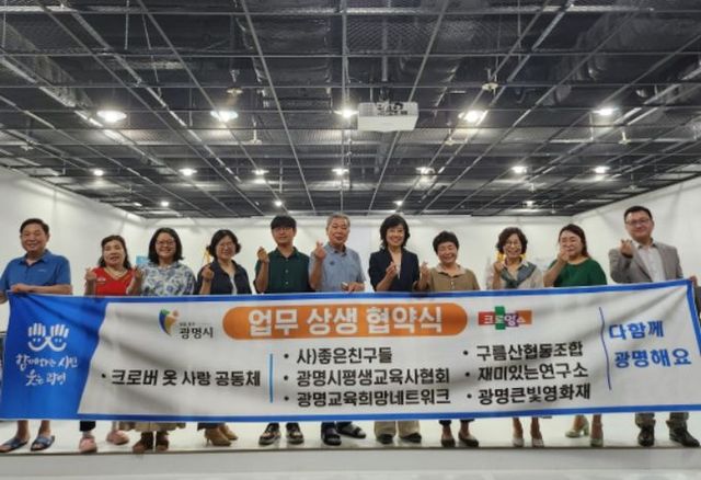 크로버옷사랑공동체는 공모사업 추진을 위해 12일 지역사회 단체인 ▲(사)좋은친구들 ▲구름산협동조합 ▲광명시평생교육사협회 ▲재미있는연구소 ▲광명교육희망네트워크 ▲광명큰빛영화제와 업무 상생 협약을 체결했다.
