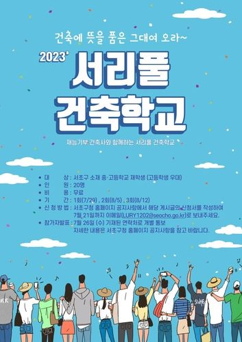 서울 서초구(구청장 전성수)는 오는 29일부터 새달 12일까지 미래 건축가를 꿈꾸는 지역 내 청소년을 대상으로 '서리풀 건축학교'를 운영한다. 오는 21일까지 지역 내 중·고등학생 20명을 모집한다.