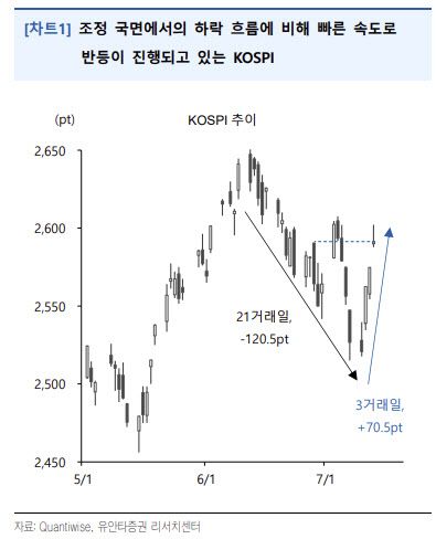 조창민 유안타증권 연구원은 14일 “13일 코스피 지수는 2596.93포인트에 마감하며 3거래일 연속 상승했다”며 “6월 신고가 이후 21거래일간의 조정을 거쳤던 증시는 3일만에 하락폭의 절반 이상을 회복했다”고 밝혔다.
