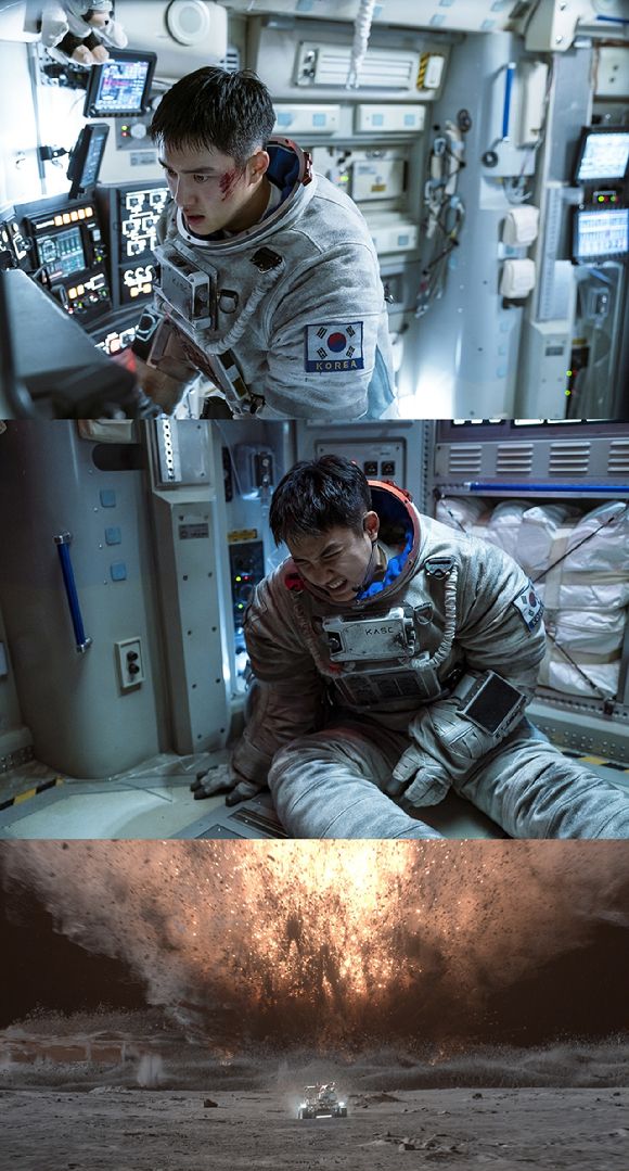 '더 문'은 사고로 인해 홀로 달에 고립된 우주 대원 선우(도경수)와 필사적으로 그를 구하려는 전 우주센터장 재국(설경구)의 사투를 그린 영화다. 머나먼 우주, 대한민국 우주센터, 그리고 미국 NASA 각자의 자리에서 사투를 벌이는 인물들의 긴박한 이야기를 예고한다.
