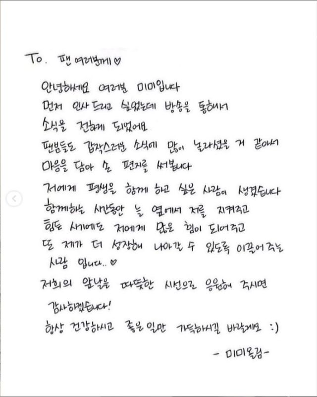미미는 "저희의 앞날을 따뜻한 시선으로 응원해 주시면 감사하겠다. 항상 건강하시고 좋은 일만 가득하시길 바랄게요"라고 전했다.