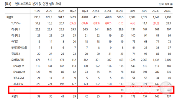 한편 14일 나온 한화증권 보고서에는 TL의 2023년 매출을 300억 원, 2024년 매출 추정치를 2410억 원으로 잡았다. 2024년 '리니지W'의 예상 매출 5250억 원에 비해 절반 수준이다. 4690억 원의 '리니지M' 2024년 예상 매출 보다 낮았고, '리니지2M'의 3350억 원보다 낮았다.