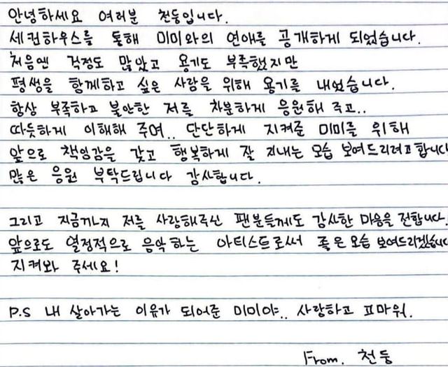 천둥은 "처음엔 걱정도 많았고 용기도 부족했지만 평생을 함께하고 싶은 사람을 위해 용기를 내었습니다"라며 "항상 부족하고 불안한 저를 차분하게 응원해 주고 따듯하게 이해해 주며 단단하게 지켜준 미미를 위해 앞으로 책임감을 갖고 행복하게 잘 지내는 모습 보여드리려고 합니다"라고 했습니다.