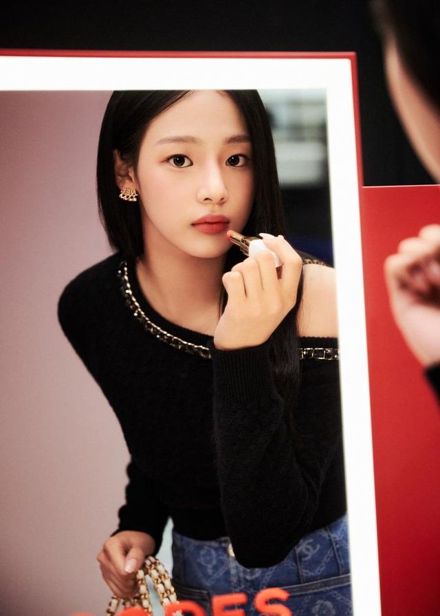 매력적인 레드 립을 부드럽고 은은하게 연출한 아이브 이서는 루쥬 코코 플래쉬 91 보헴을 선택. 투명하고 맑은 피부는 컬러 피그먼트가 담긴 마이크로 버블이 특징인 레 베쥬 뚜쉬 드 뗑으로 연출했다.