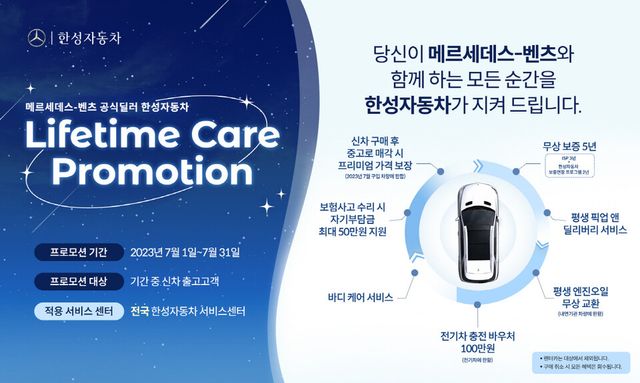 메르세데스-벤츠 공식 딜러 한성자동차는 신차 구매 고객을 대상으로 ‘Lifetime Care Package(평생 케어 패키지)’ 특별 프로모션을 31일까지 진행한다고 14일 밝혔다.