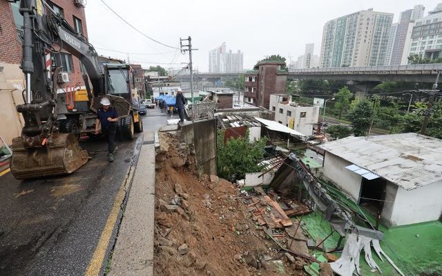 14일 오전 지난밤 폭우로 축대가 무너져 통제된 서울 서대문구 연희동 도로 / 연합뉴스