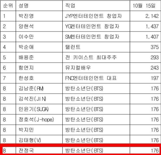 앞서 방 의장으로부터 총 47만8,695주(1인당 6만8,385주)를 증여 받은 방탄소년단(BTS) 멤버들도 단번에 주식부자가 됐습니다. 특히 BTS 멤버 중 1997년생인 정국이 연예인 주식부자 중 최연소가 됐습니다.