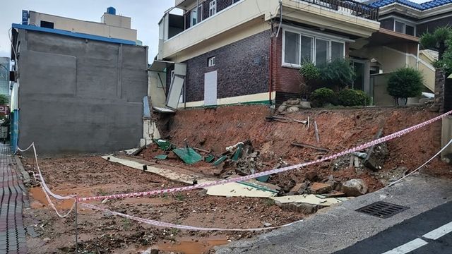 15일 광주 남구 월산동의 한 빈 주택 옆 담벼락이 무너져 당국이 방수포를 덮는 등 안전조치를 취하고 있다. / 이하 뉴스1