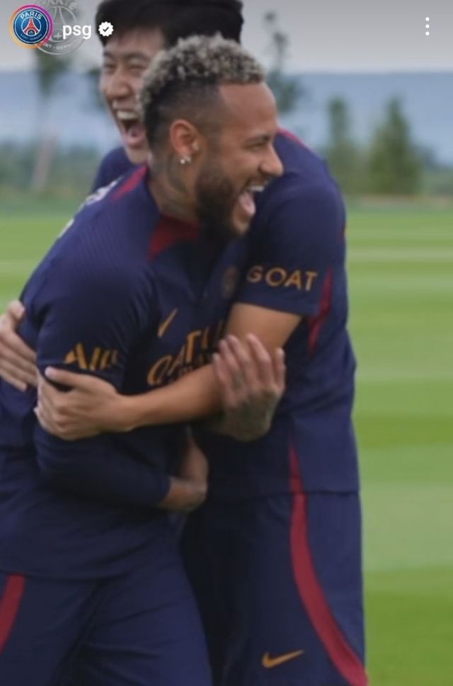 PSG 선수들과 이강인이 훈련을 진행하는 영상이 담겨있었다. 여기서 놀라운 장면은 이강인과 네이마르였다. 두 선수는 찰나의 순간이었지만 서로 훈련 도중에 함께 껴안으면서 웃음이 터진 모습을 보여줬다. 훈련 도중에 서로 눈빛을 주고받는 장면도 영상에 포착됐다.