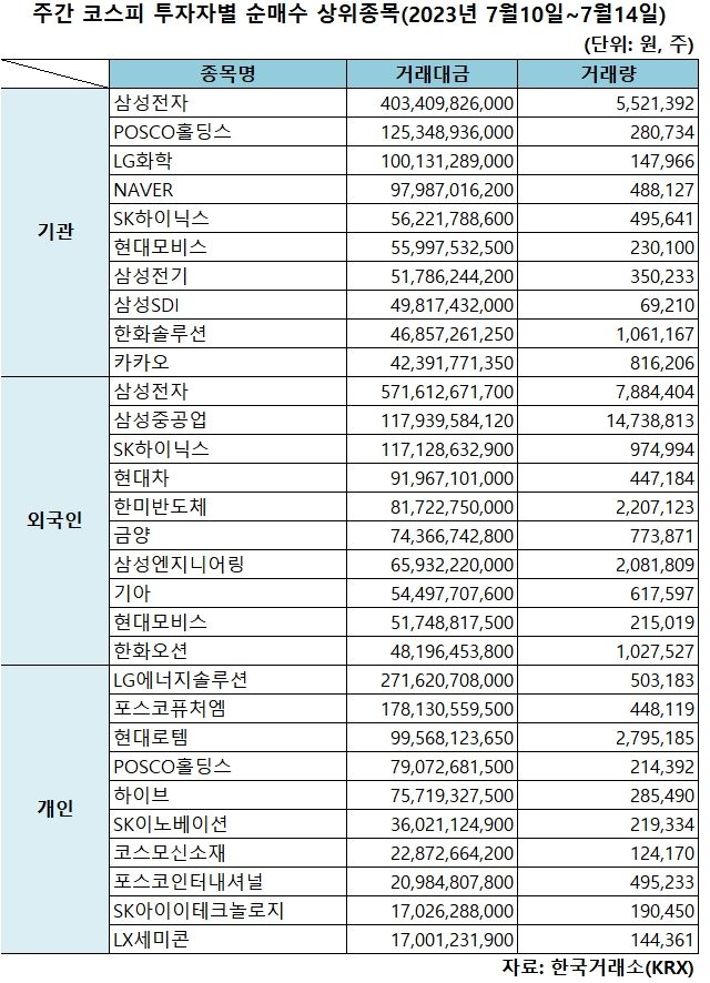 [표] 주간 코스피 기관·외인·개인 순매수 상위종목(7월10일~7월14일)