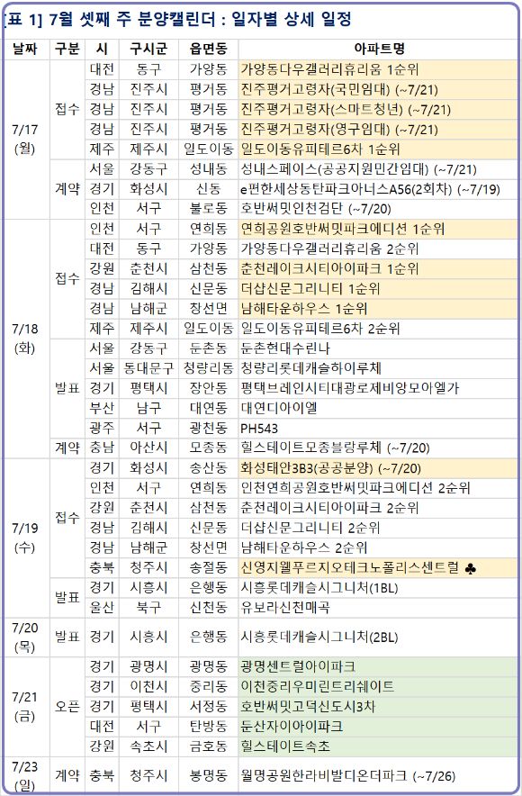 인천 서구 연희동 '연희공원호반써밋파크에디션', 강원 춘천 삼천동 '춘천레이크시티아이파크', 경남 김해 신문동 '더샵신문그리니티' 등에서 청약을 진행한다.