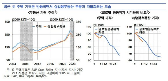 최근 들어 미국의 주택 가격은 상업용 부동산과 달리 고금리 상황에도 반등 조짐을 보이고 있다. 주택 가격은 고점 대비 6.8% 조정됐다가 지난 2월 이후 3.5% 반등했다. 최근 2년간 주택 가격은 금융위기 때보다 하락 폭이 작고 반등도 빠르다는 평가다.