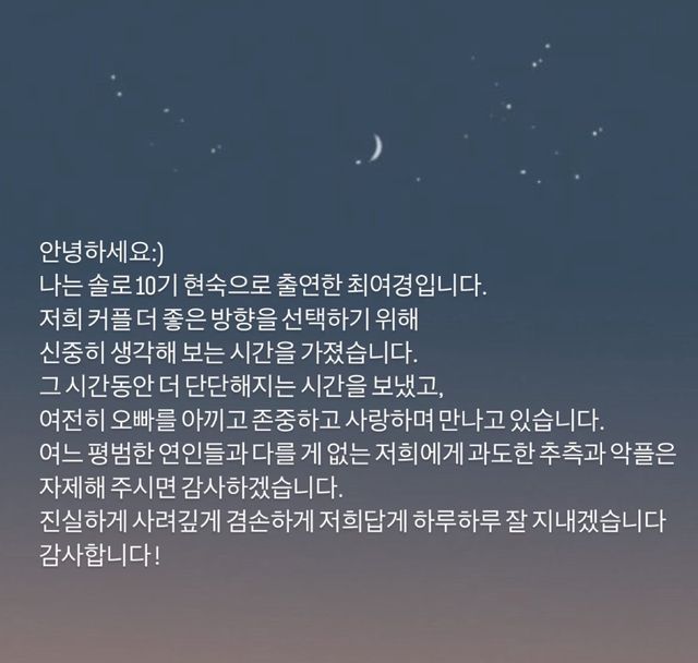 안녕하세요. '나는 솔로' 10기 현숙(가명)으로 출연한 최여경(본명)입니다. 저희 커플 더 좋은 방향으로 선택하기 위해 신중히 생각해 보는 시간을 가졌습니다.
