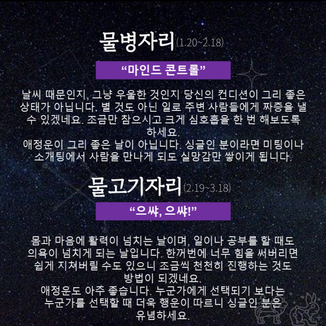 날씨 때문인지, 그냥 우울한 것인지 당신의 컨디션이 그리 좋은 상태가 아닙니다. 별 것도 아닌 일로 주변 사람들에게 짜증을 낼 수 있겠네요. 조금만 참으시고 크게 심호흡을 한 번 해보도록 하세요.