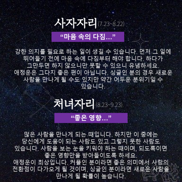 싱글인 분이라면 어느 정도 나이차가 나는 사람과 연이 닿을 수 있습니다. 커플인 경우에는 사랑에 변화의 기운이 들어와 있네요. 이 변화를 좋게 가져가느냐 나쁘게 가져가느냐는 당신의 손에 달려 있습니다.