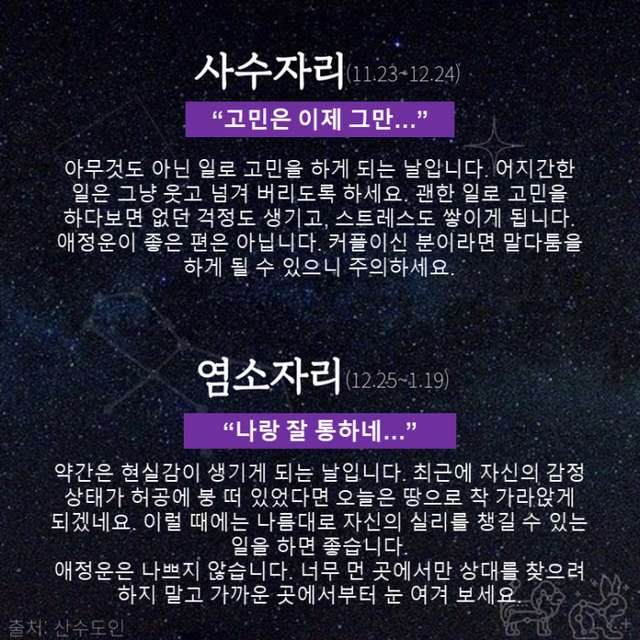 약간은 현실감이 생기게 되는 날입니다. 최근에 자신의 감정 상태가 허공에 붕 떠 있었다면 오늘은 땅으로 착 가라앉게 되겠네요. 이럴 때에는 나름대로 자신의 실리를 챙길 수 있는 일을 하면 좋습니다.